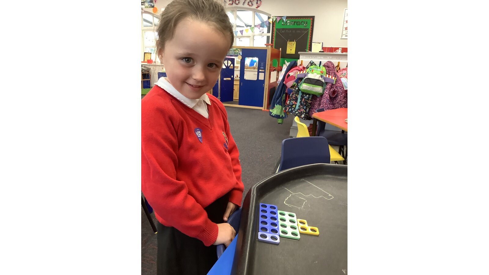 This week the children have been introduced to the Monster Phonics monsters and started learning the sounds ‘s, a, t and p’. Also, our focus in Maths has been learning about matching shape, colours, patterns and quantity.