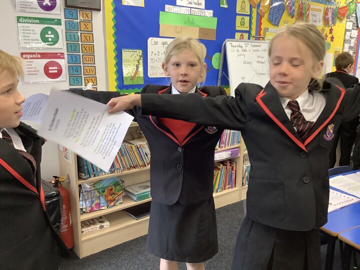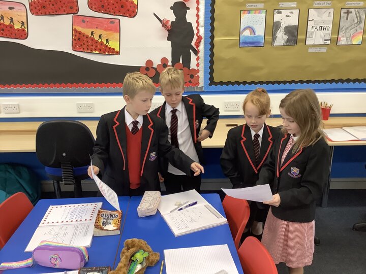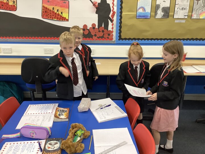 We’ve had another great week in Class 3. In English we have been reading and analysing the famous poem ‘In Flanders Field’ which is linked to our history topic about WW1. We have worked together to understand the meaning behind some of the words and in groups we performed the poem using great expression and enthusiasm. In Maths, Year 3 have moved onto addition and subtraction. We have been learning how to add and subtract 3-digit numbers and 1-digit numbers. To help us, we used cubes and base ten equipment. Year 4 have been learning about negative numbers and we researched real-life examples of when these are used. We have also learned about Roman numerals and enjoyed singing a song to help us to remember them. In Science this week, we have learnt about the 7 characteristics of all living things which we comprised into a funny acronym called MRS NERG. We then used the laptops and iPads to research why certain animals live in particular habitats. Class 3 gave an extra special thank you to Maisie’s uncle who brought in all of his WW1 memorabilia and we had great fun trying on the soldiers’ helmets, holding weaponry and we even got to hold a stuffed rat which the children were particularly enthused about! Well done Class 3, keep up the hard work.
