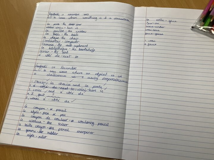 Today, in French we continued our learning of the 'School Life' topic. We remembered the classroom furniture items from last week and this week we discussed the items in our pencil cases. We learnt some prepositions - à coté de (next to), sur (on) and (sous) "under" and had fun choosing the correct preposition to say exactly where things were in the classroom by setting up different scenarios. Afterwards, we watched a typical day in a French school and discussed the differences between our day in the UK and their day - the most notable one being the fact that school uniform is not mandatory in France! Have a wonderful weekend and see you all on Monday.
