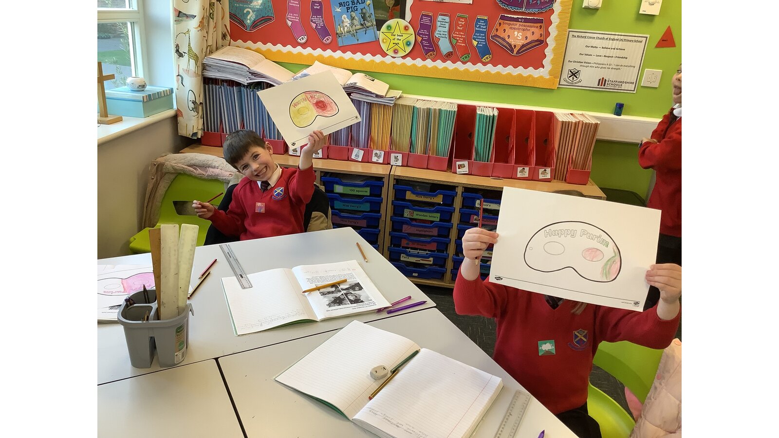 In RE, we delved into the Jewish festival of Purim. To understand why Jews celebrate Purim, we listened to the story of a kind Jewish girl named Esther. A Long time ago, this brave woman was chosen to be the queen of Persia. Through her bravery she saved all the Jews from being hurt by Haman. We learnt one of the ways Jews celebrate is to dress up in elaborate clothes and wear masks. So, in the spirit of Purim, we made our own vibrant masks. Our Geography adventure has begun with Buddy the Bee. First stop France! We explored French culture, cuisine, and famous landmarks like the Eiffel Tower. A classroom scavenger hunt helped us recall the places Buddy had visited. We're all eager to see where his next journey will take us! In English, we've been hard at work writing a recount of Remembrance Day. We made sure to include all the features of a recount we learnt about, like our question sentence as a way of engaging the reader. Class two have tried super hard, and that has shown through their writing. Well done Class two! We've been up to all sorts in Maths, from practicing comparing numbers of different values by using the symbols for greater than, less than, and equal to. Now, we're diving into the world of 2D and 3D shapes, so far, we’ve been learning to identify their features so we can spot similar shapes. What a busy week we have had!