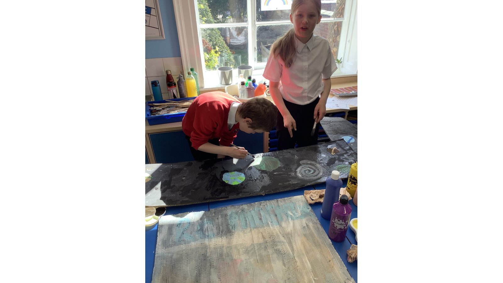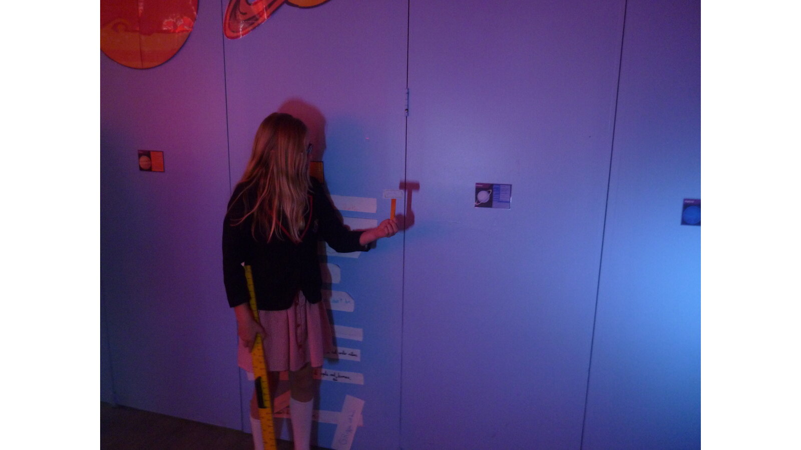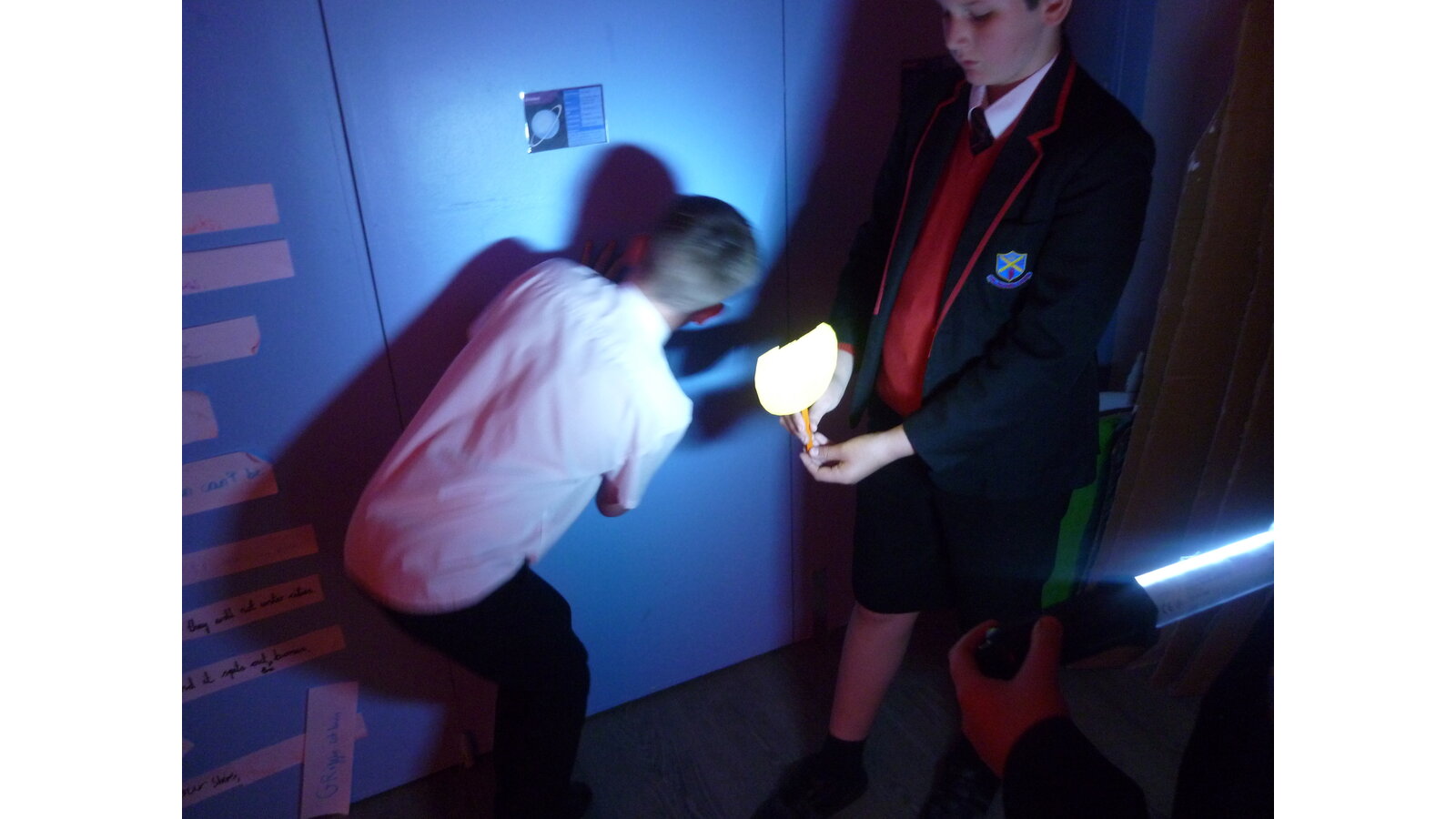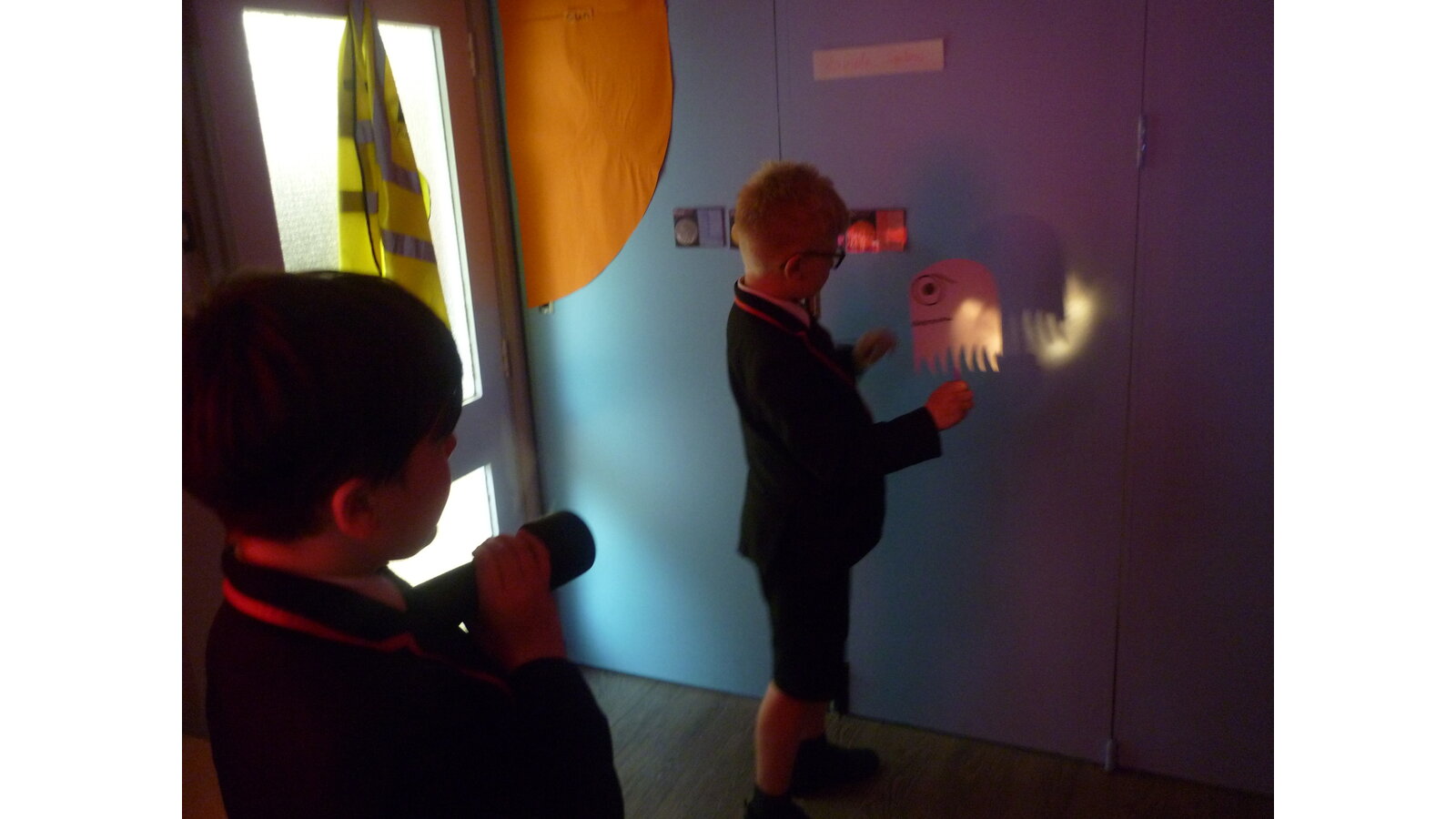 In science, we have been experimenting with shadows seeing what happens when we change the distance from a light source to an object. We discovered that the further away the light source from an object, the smaller the shadow was. We also discussed how the sun's location in the sky throughout the day alters shadows on the ground.