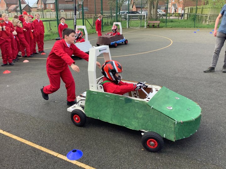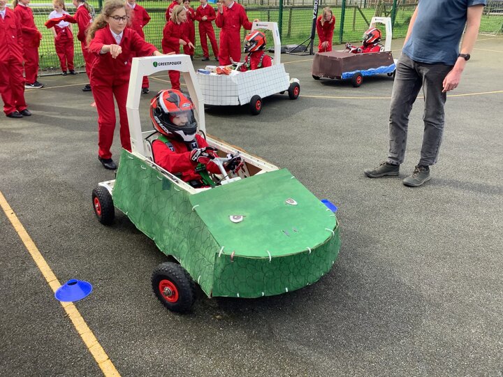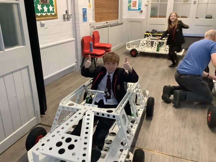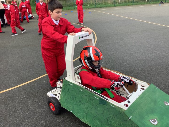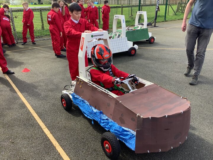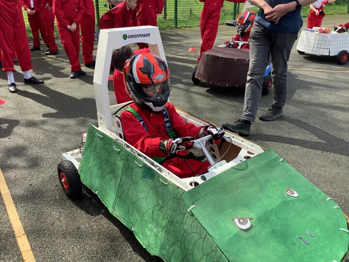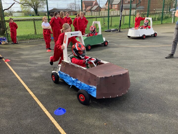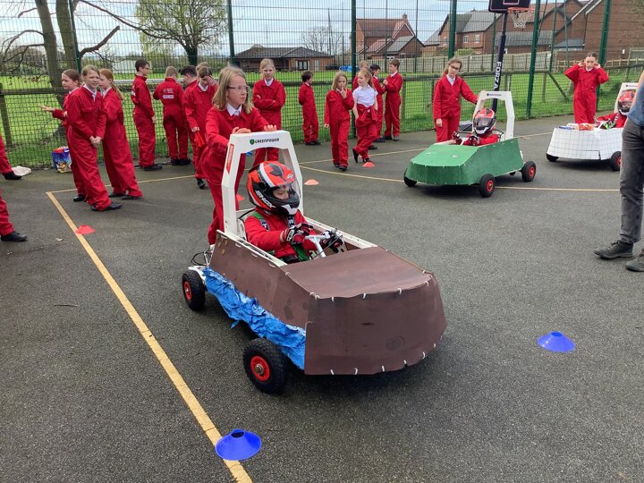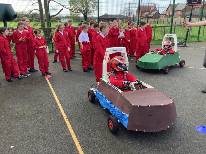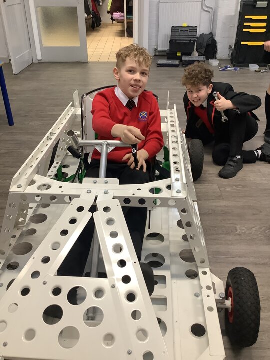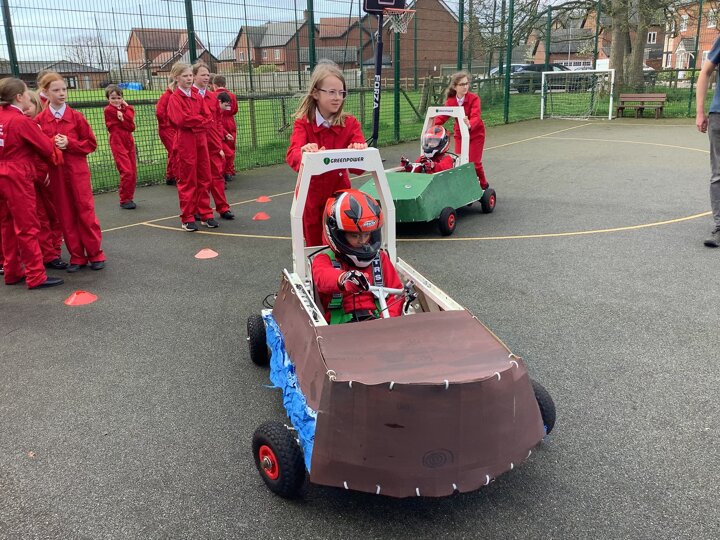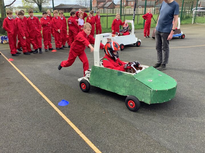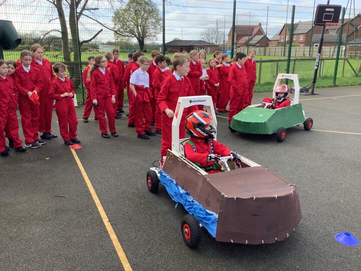 Over the last few months, our year 5 and 6s have been working on Go-Karts. It has been a very fun experience and we are extremely grateful to have Dr Allen come into our school and help us. Our class has been split into 3 teams who decided to make their themes : Team Tesco, The Dragon Riders and The Jolly Rogers (us). The first session was on the 14th of December (2023) when we did risk assesments and discussed team ideas. On our next session on the 8th of January (2024) we collectively decided to do a pirate themed car as well as creating mini models of the car and body work. Over the next few sessions we began our car and bodywork. Year 6 built the Go-Kart and Year 5 created the cardboard bodywork. Our design was a pirate ship with rats on the back, a flag, a skull and crossbones on the bonnet, waves down the side and a number plate on the front. We look forward to race day when we race against other schools from throughout Staffordshire. (Written by Ernie and Alex from Team Jolly Rogers)